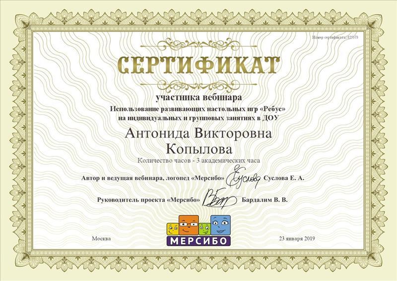 | Сертификат участника вебинара "Использование развивающих настольных игр "Ребус" на индивидуальных и групповых занятиях в ДОУ", 2019г. |