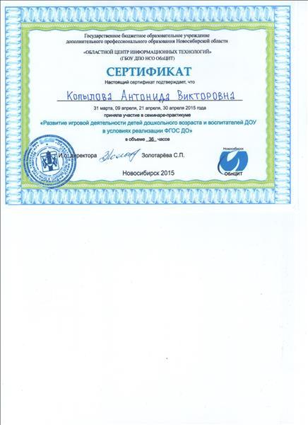 | Сертификат участника семинара-практикума "Развитие игровой деятельности детей дошкольного возраста и воспитателей ДОУ в условиях реализации ФГОС ДО", 2015 г. |