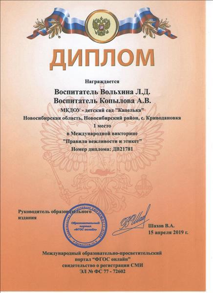| Диплом участника в Международной викторине "Правила вежливости и этикет" 1 место., 2019 г. |