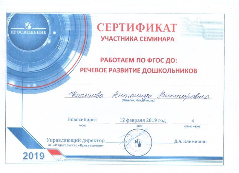 | Сертификат участника семинара, работаем по ФГОС ДО: "Речевое развитие дошкольников",2019г. |