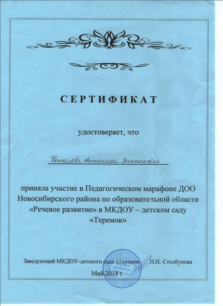 | Сертификат участника в Педагогическом марафоне ДОО Новосибирского района по образовательной области №Речевое развитие", 2018г. |