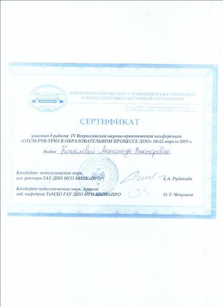 | Сертификат участия в работе IV Всероссийской научно-практической конференции "ОТСМ-РТВ-ТРИЗ В ОБРАЗОВАТЕЛЬНОМ ПРОЦЕССЕ ДОО", 2019 г. |