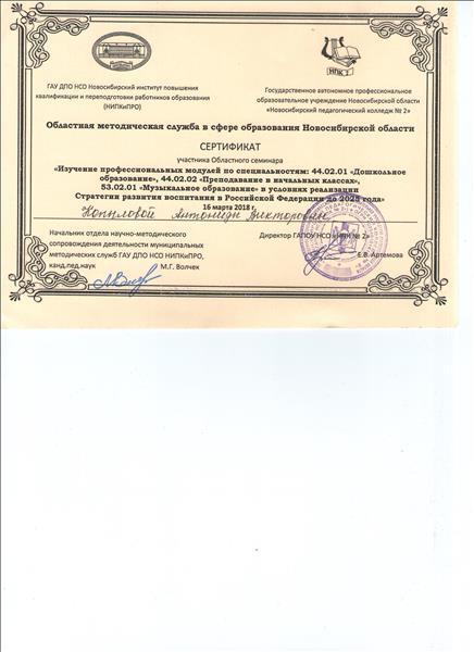 | Сертификат участника областного семинара "Изучение профессиональных модулей по специальности "Дошкольное образование" в условиях реализации Стратегии развития воспитания в Российской Федерации до 2025 года" , 2018 г. |