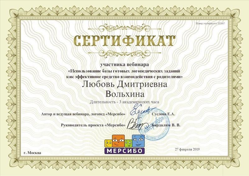 | Сертификат участника вебинара "Использование базы готовых логопедических заданий как эффективное средство взаимодействия с родителями", 2019г. |