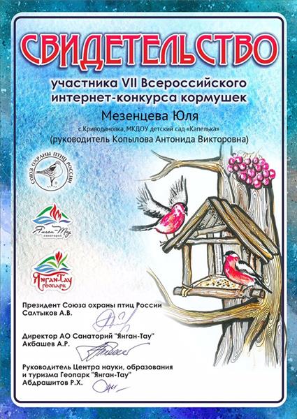 | VII Всероссийский интернет-конкурс кормушек | Всероссийский уровень | 01.11.2018 | 20.03.2019 | Свидетельство участника | Файл (JPG; 72Кб) | Файл (JPG; 71Кб) |