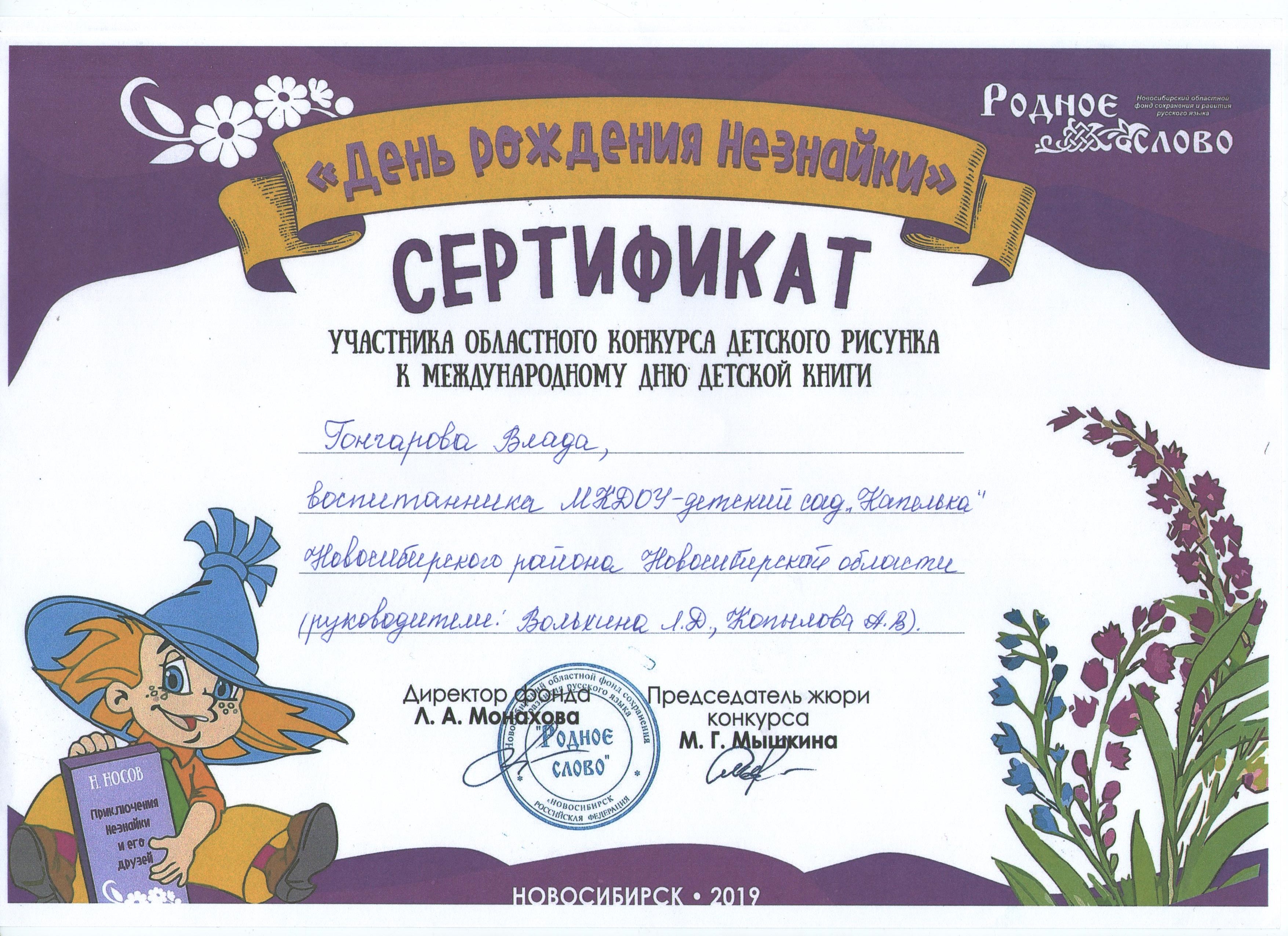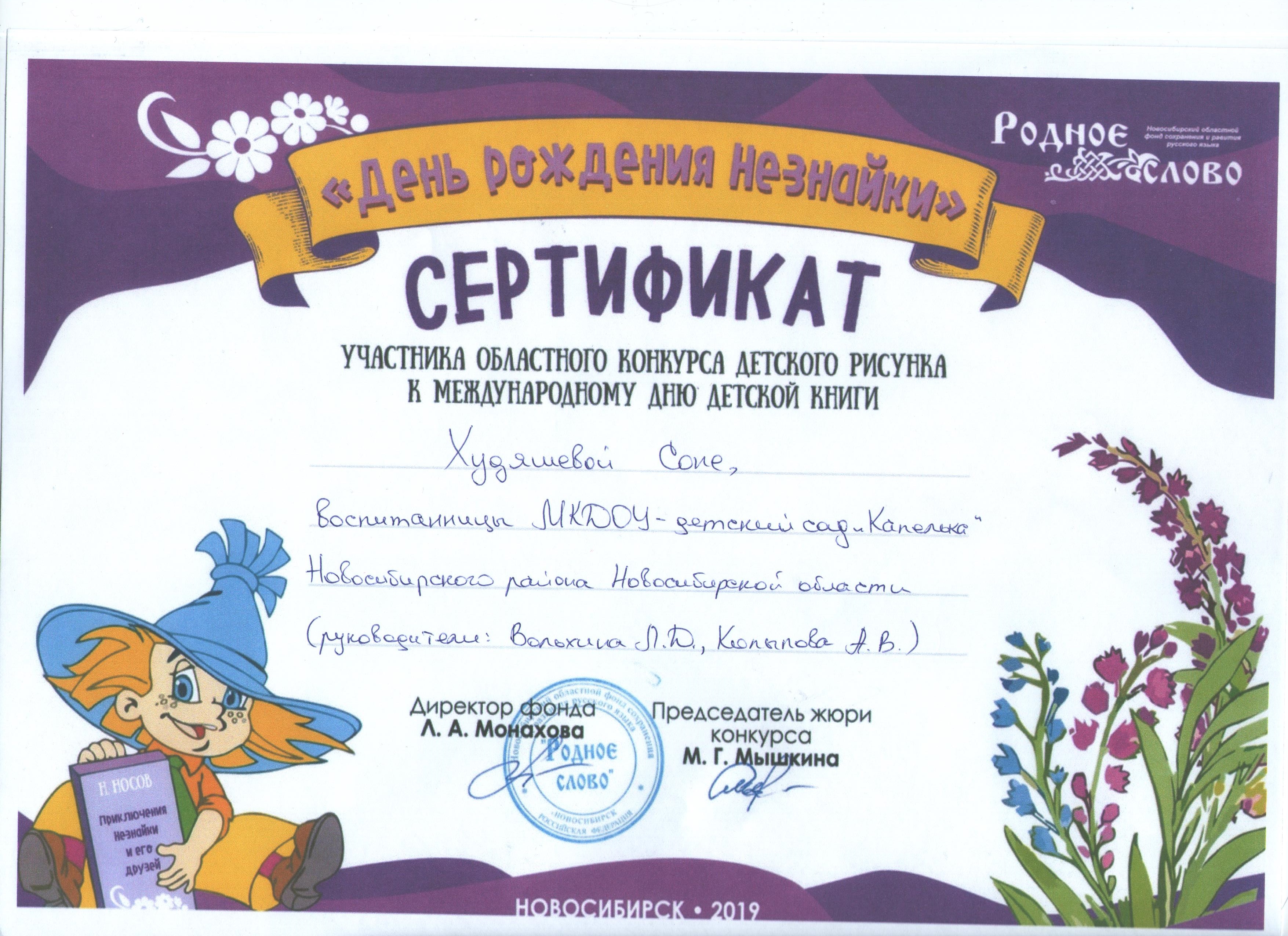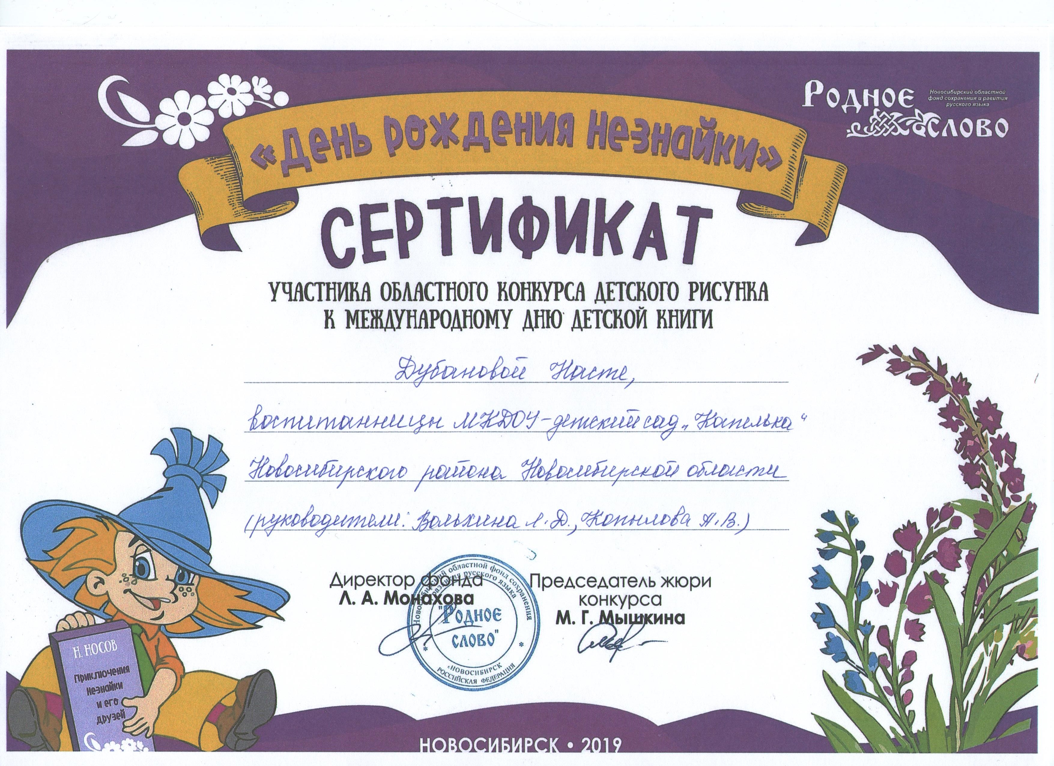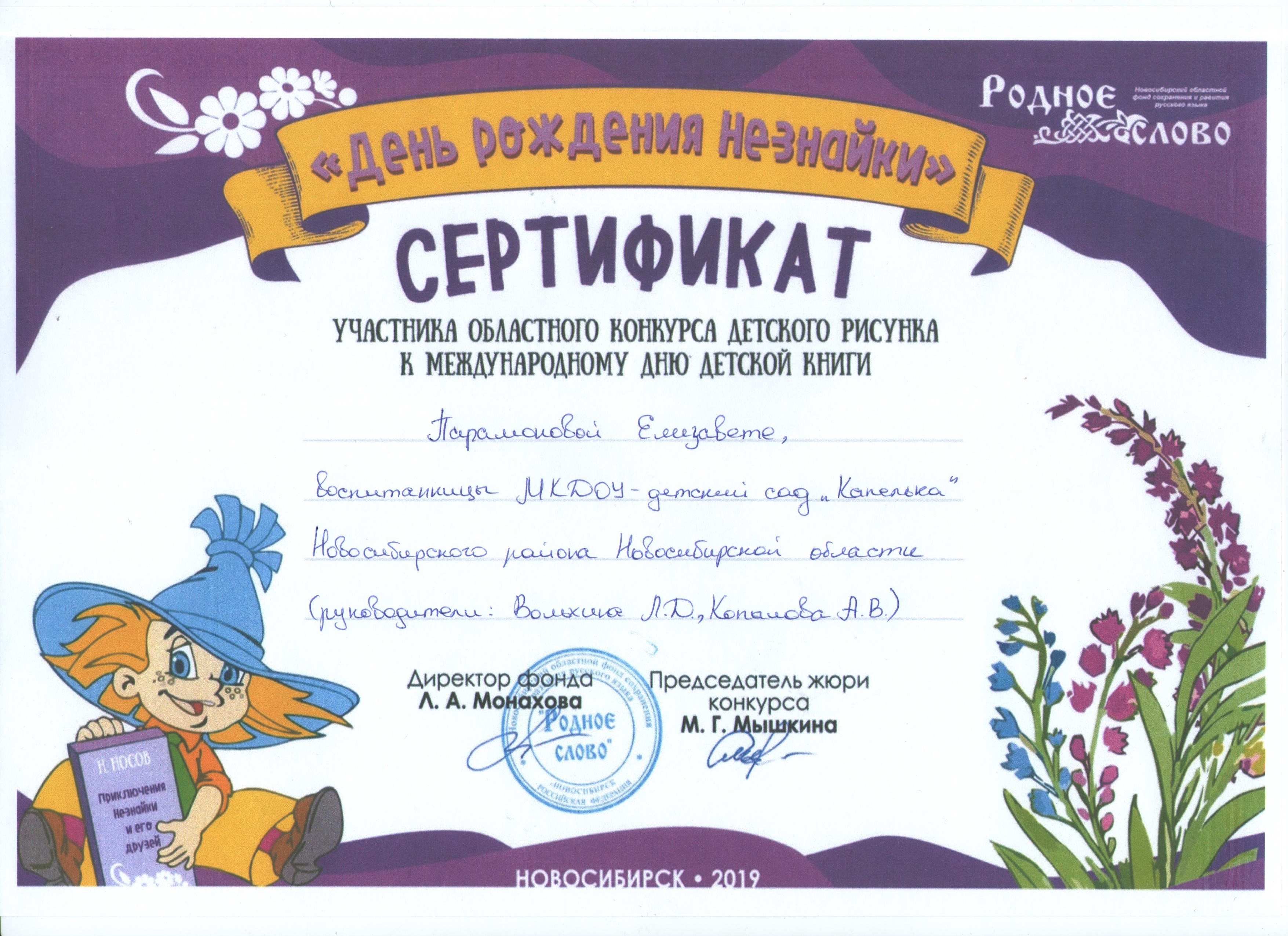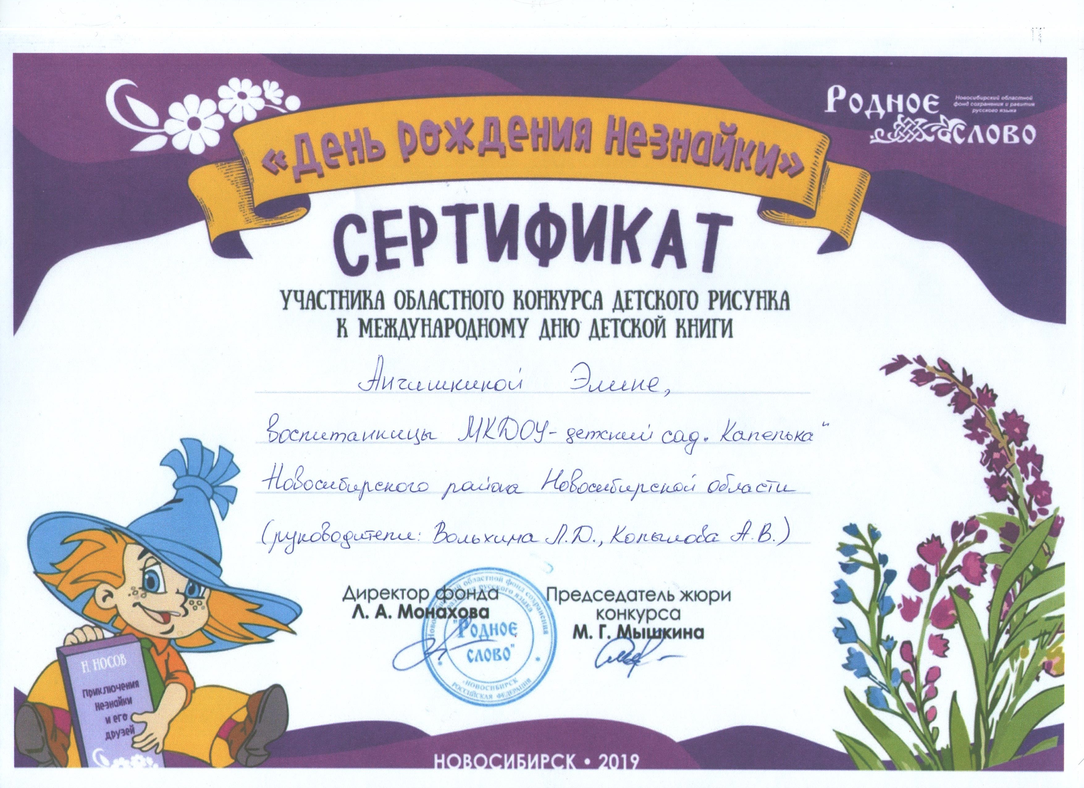 | Областной конкурс детского рисунка к международному дню детской книги "День рождения Незнайки" | Районный уровень | 15.02.2019 | 20.03.2019 | Сертификат участника | Файл (JPG; 18Кб) | Файл (JPEG; 2Мб) |