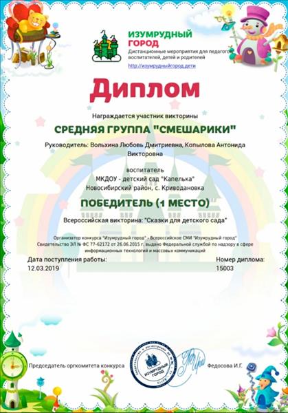 | Всероссийская викторина "Сказки для детского сада" | Всероссийский уровень | 12.03.2019 | 12.03.2019 | Диплом 1 место | | Файл (JPG; 47Кб) |