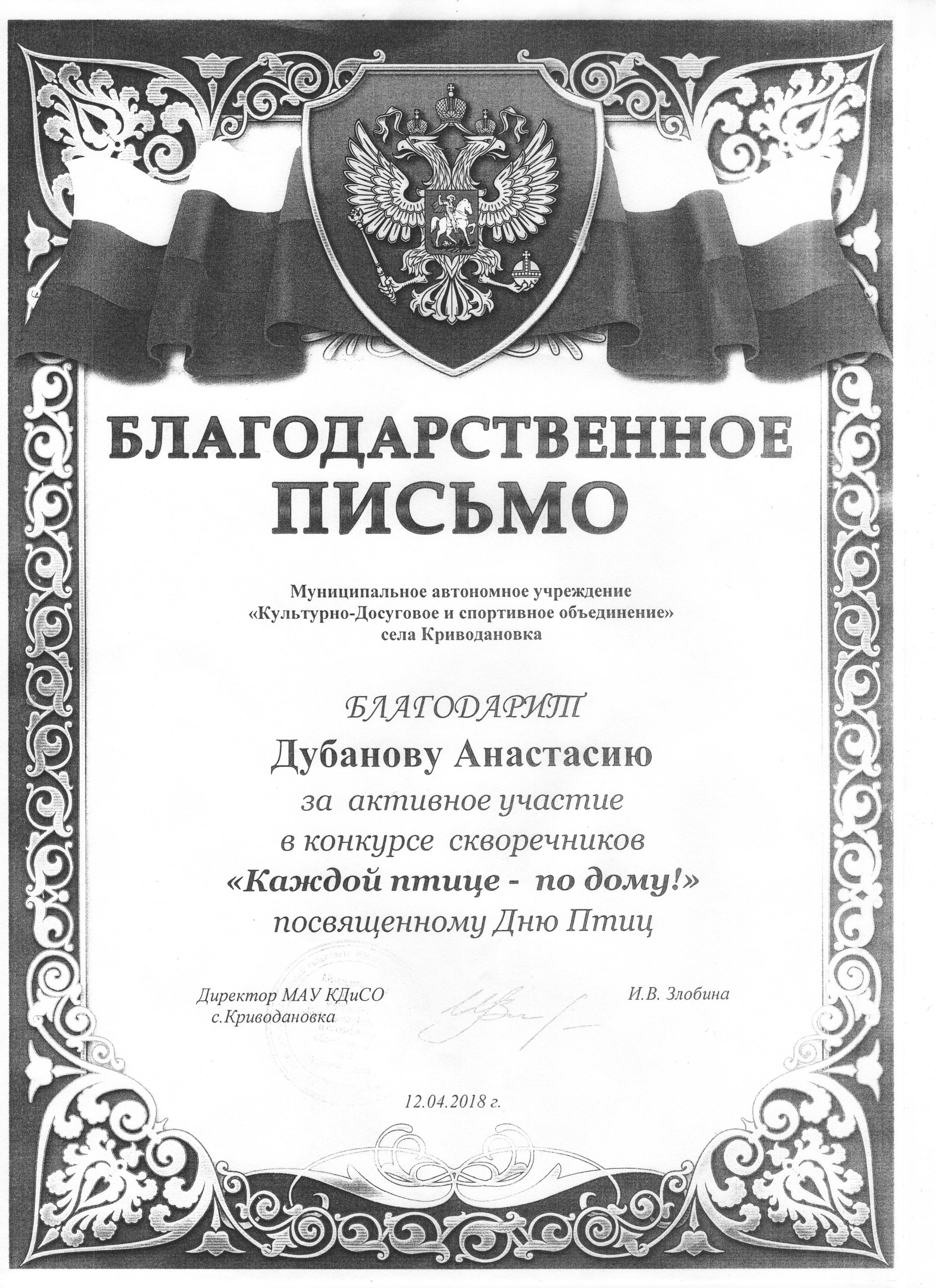 | VII Всероссийский интернет-конкурс кормушек | Всероссийский уровень | 01.11.2018 | 20.03.2019 | Свидетельство участника | Файл (JPG; 68Кб) | Файл (JPG; 71Кб) |