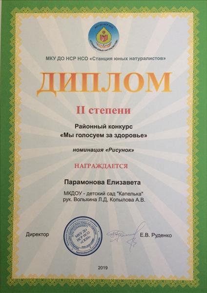 | Районный конкурс "Мы голосуем за здоровье" | Районный уровень | 10.02.2019 | 20.03.2019 | Диплом II степени | | Файл (JPG; 34Кб) |